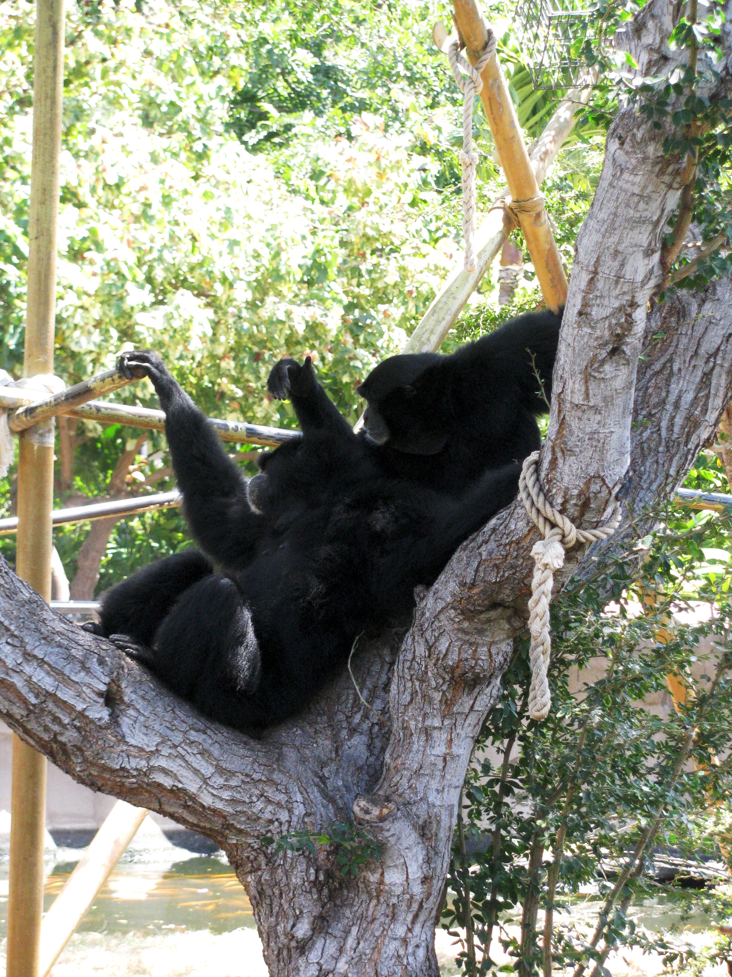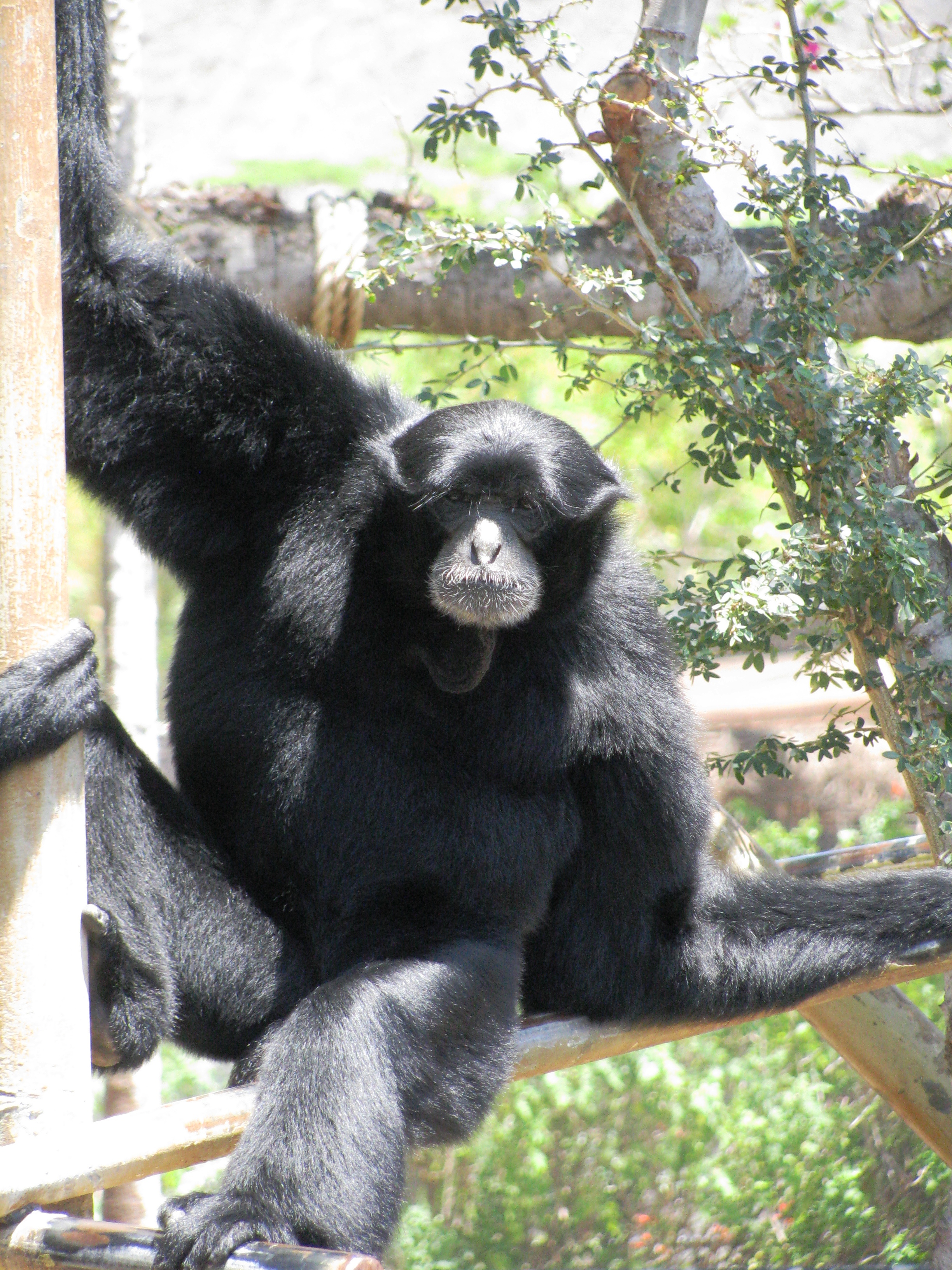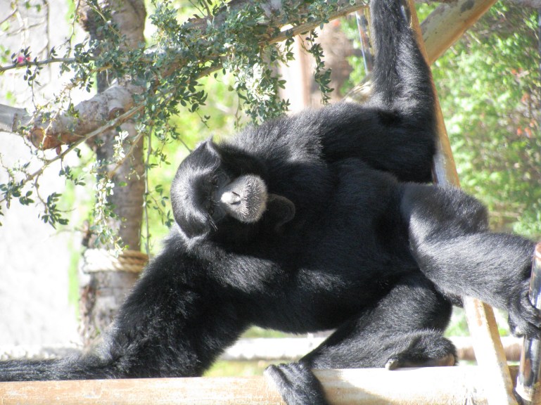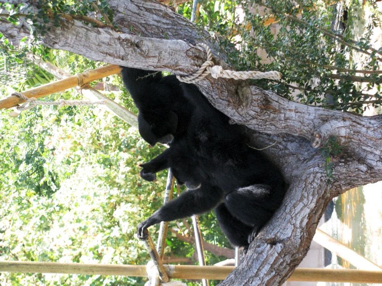 Glad you asked. It’s a siamang! There are two of them at the zoo, and they’re loud and can be very active. They’re lesser apes (a type of gibbon to be specific), and are found in Asia. They have these big throat pouches that they fill with air to make the loud call I showed you in the video, and they love to swing and flip around in the trees. Not monkeys, gorillas or chimps, but especially not monkeys. No tails. Plus, they walk more upright than on all fours and have a relatively large head compared to their bodies, which are all hallmarks of apes. Monkeys have tails, walk more using all four limbs equally, and have relatively smaller heads compared to their bodies.