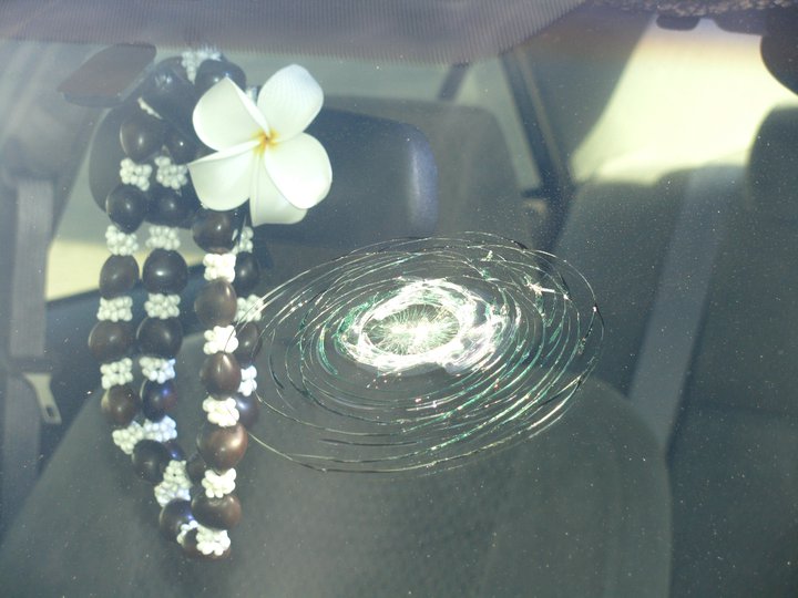 I was on my way to the zoo on Thursday morning when I heard a sound like a (relatively quiet) shot and saw this in front of my face. I didn’t see what hit me, though I’m assuming it was a rock. It looks sort of like a golf ball, but I promise I wasn’t anywhere near a golf course– I was downtown on the H1. That highway is my nemesis. I’m not kidding, either. It’s made me late more times than I can count and you can’t predict travel times (If I leave an hour early, I’ll be ten minutes late, but if I only leave a half hour early, I’ll still be ten minutes late. Always.) and it’s congested with people who don’t know where they’re going because if you follow signs that say “Waikiki” you wind up on the H1.