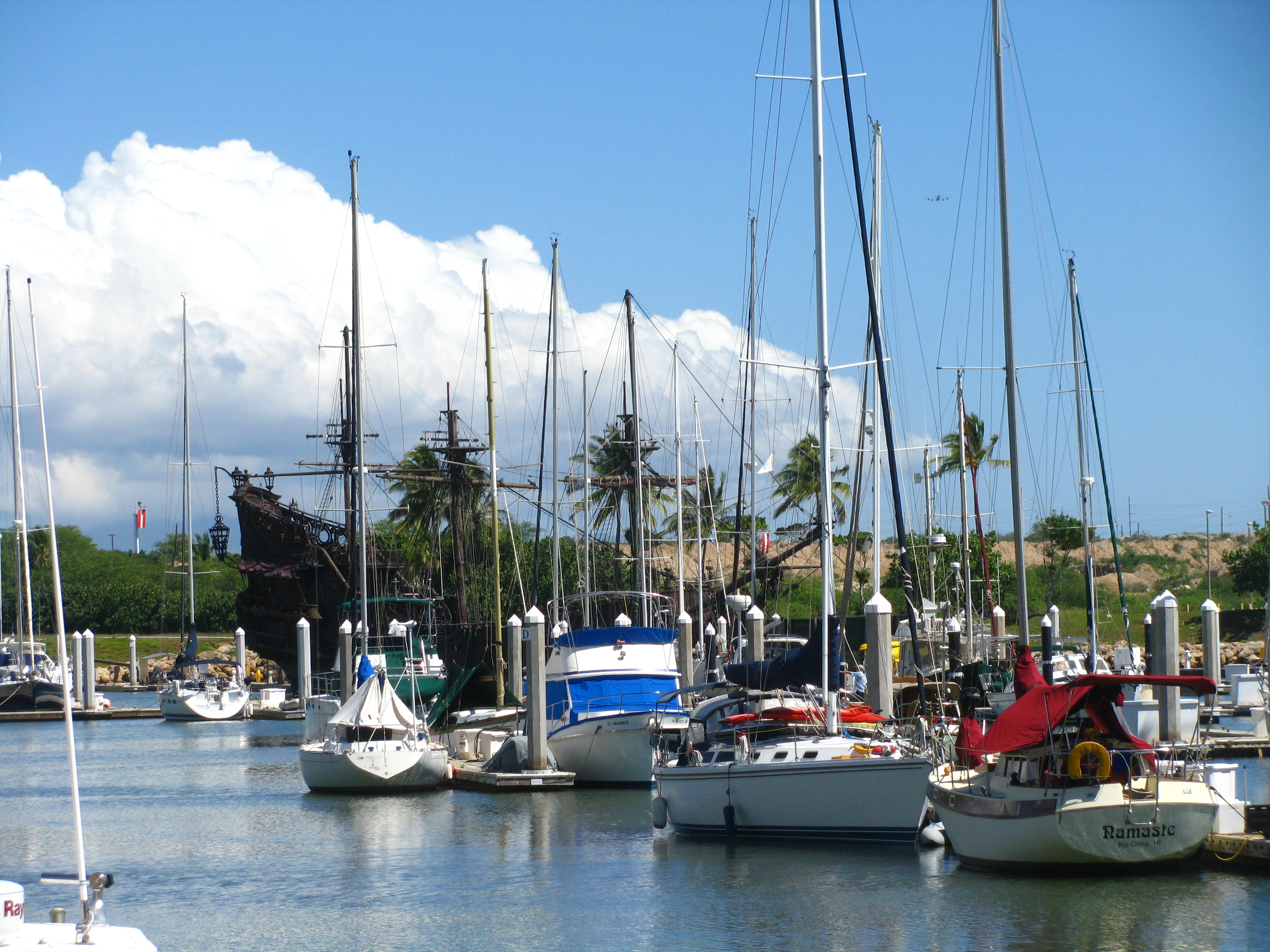 These were taken at Ko’Olina, where the ship is parked when they’re not filming. It’s here for the fourth movie, of course. I didn’t go to see it the whole time it was in Kaneohe last spring, so I decided to make a point to go this time. It worked out nicely because I went to the beach at Ko’Olina (which is the fancy time-share area and where Disney’s putting in a resort) with a friend on Friday and she knew where to find the ship.