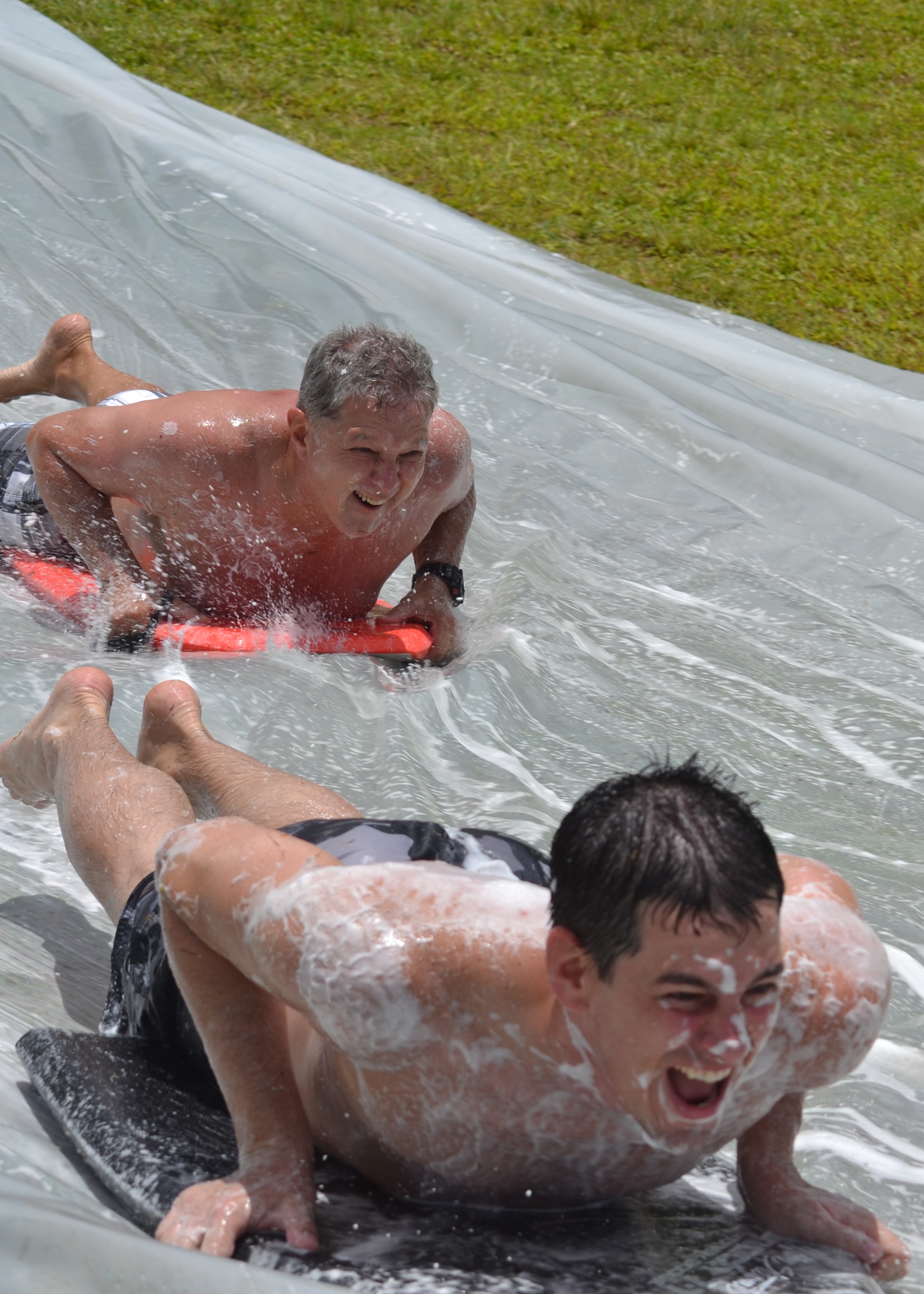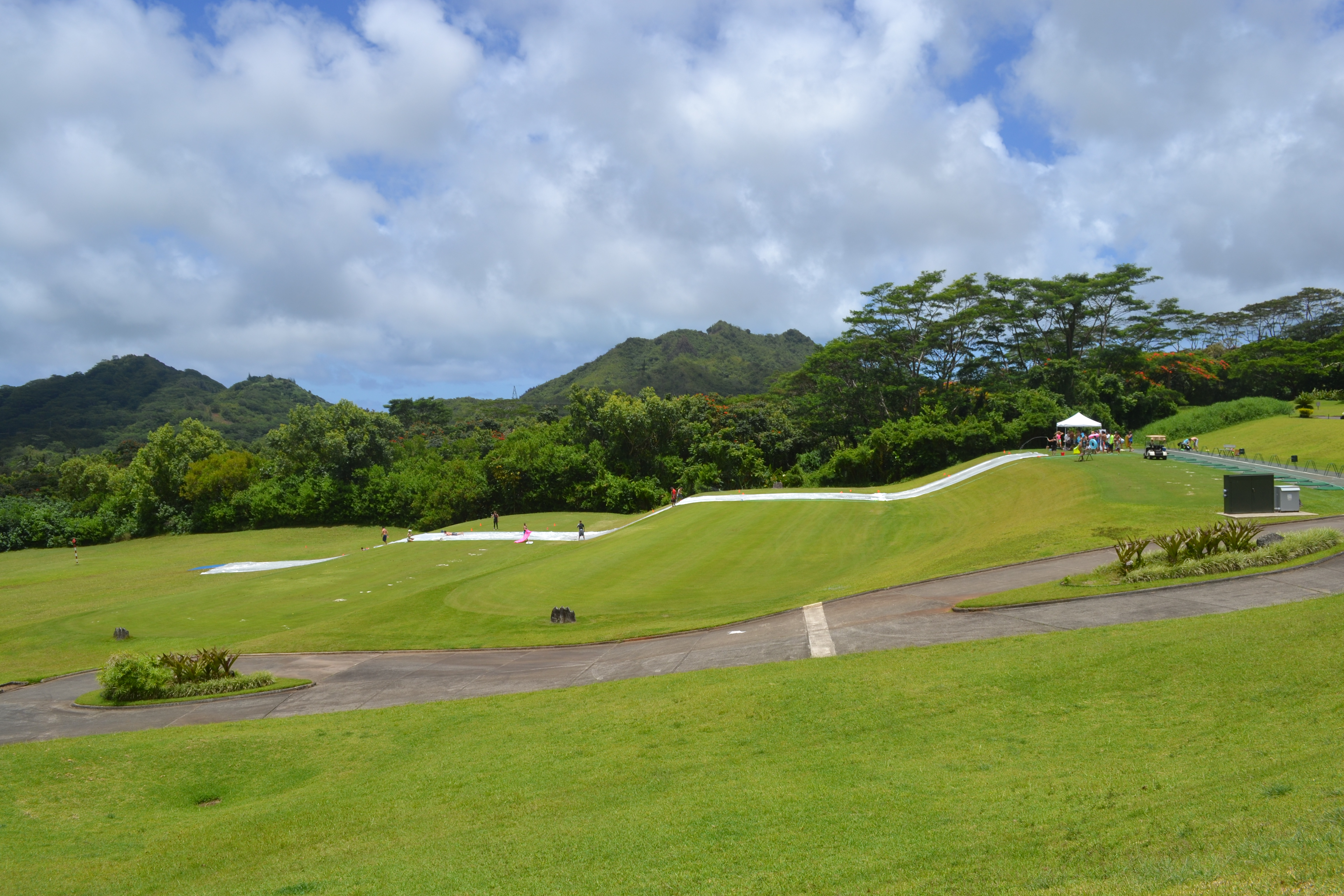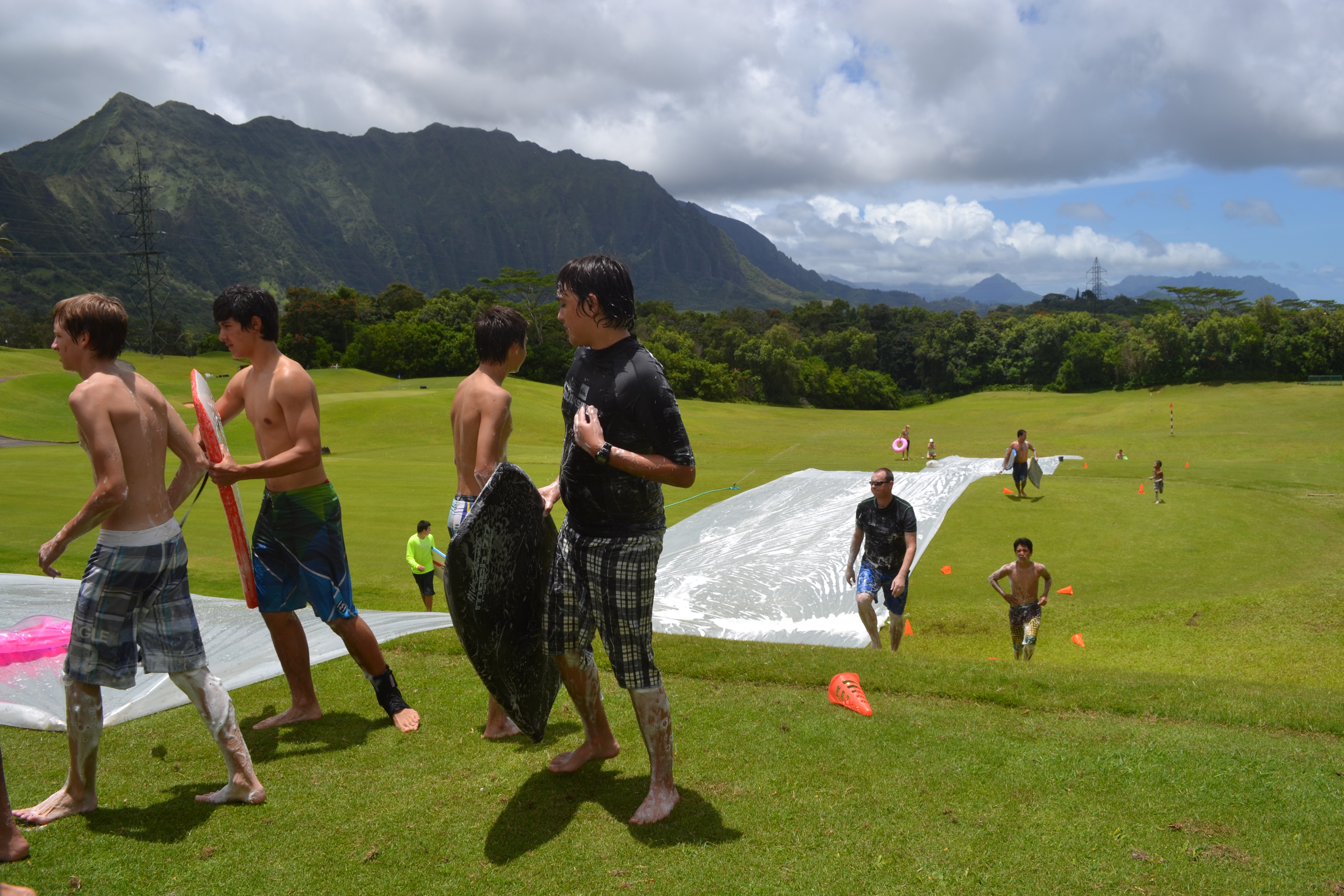 To take a little break mid-way through the slide (so everyone could catch their breath and we could acquire additional dish soap), they broke out the water balloon launchers and created a game out of shooting them from the top to the bottom of the driving range and having people try to “catch” the balloons with boogie boards.