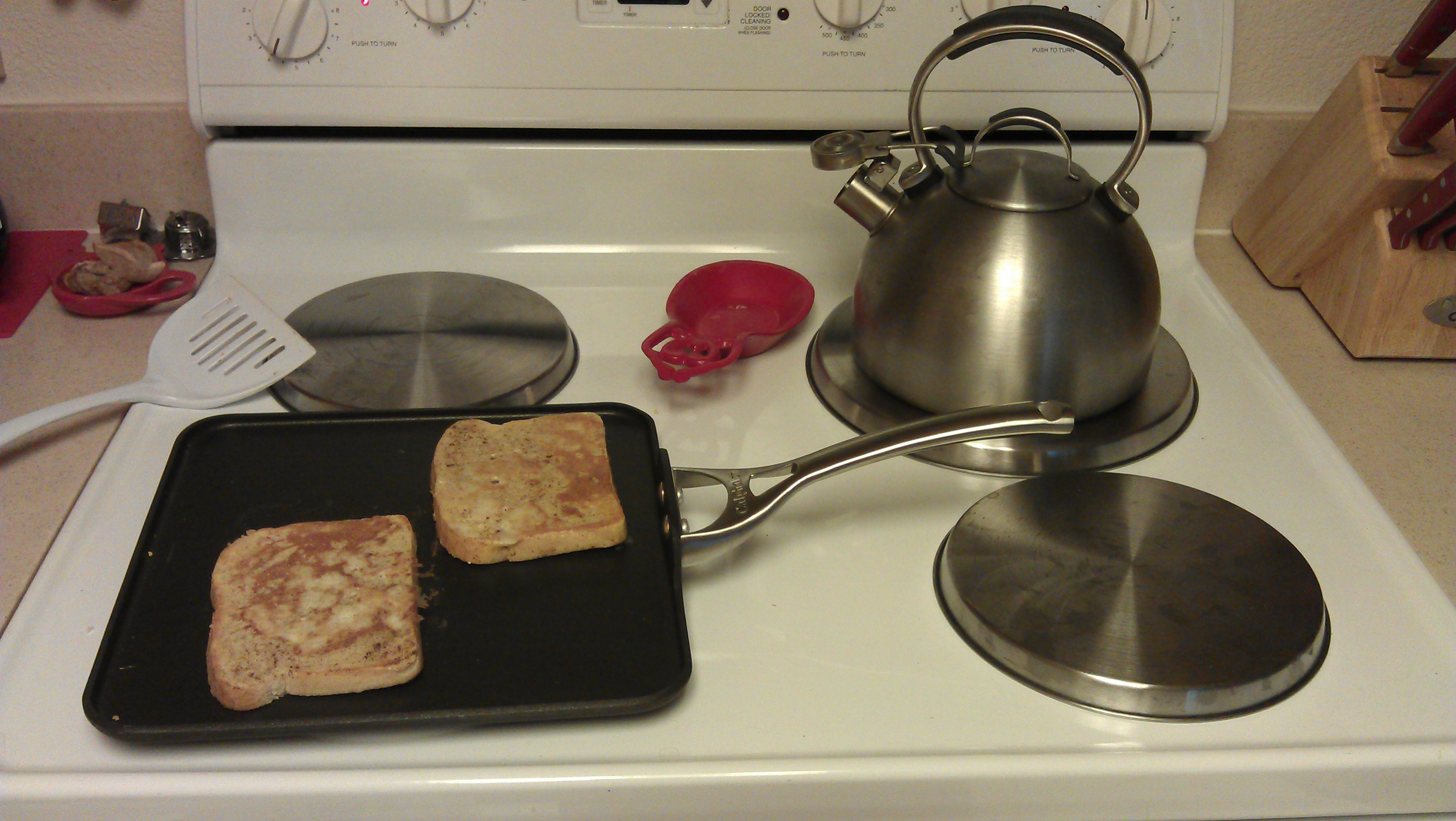 I made myself French toast today with my lovely new square, flat pan. I’m trying a new type of pan (the hard anodized kind of non-stick) because I like non-stick but Teflon and the like give me headaches, which is more than a little scary… so I think for Christmas I may ask for gift cards to get new pans. I like having some non-stick, but I think I’m mostly going to get stainless and cast iron to be honest. They’ll last longer and I know won’t ever make me sick.