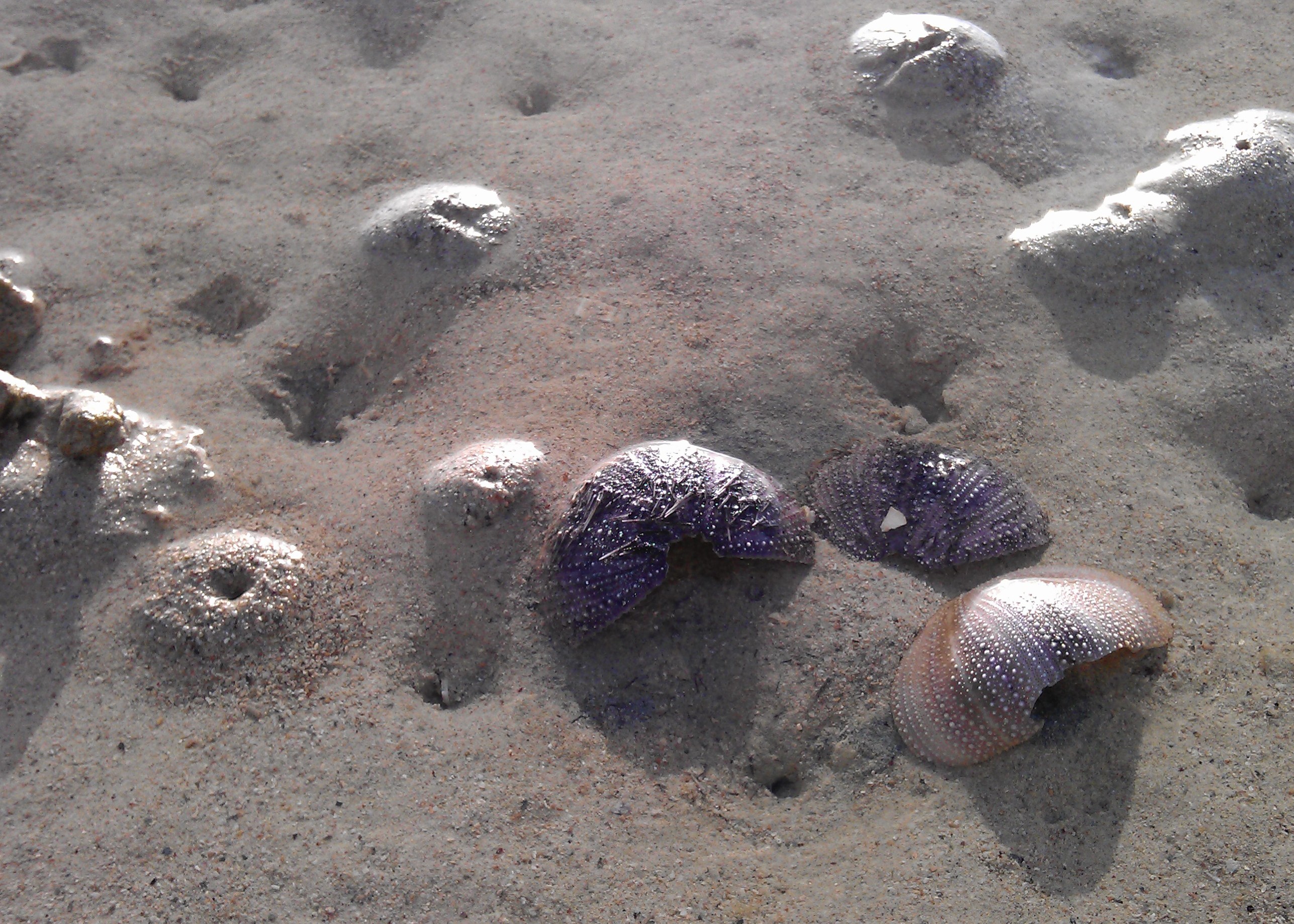 Fragments of purple on the exposed sand gave evidence of urchins.