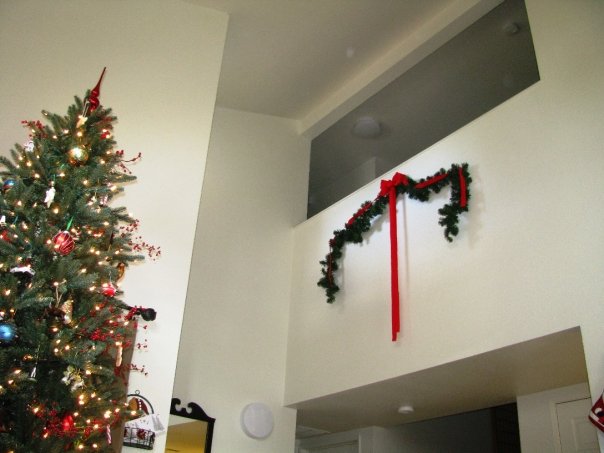 Today I finally found the last piece I wanted to go in the weird wall space above the stairs. It’s been bothering me ever since we moved into the house in October 2009. During the holidays, it’s all right because I can put garland there, like so: