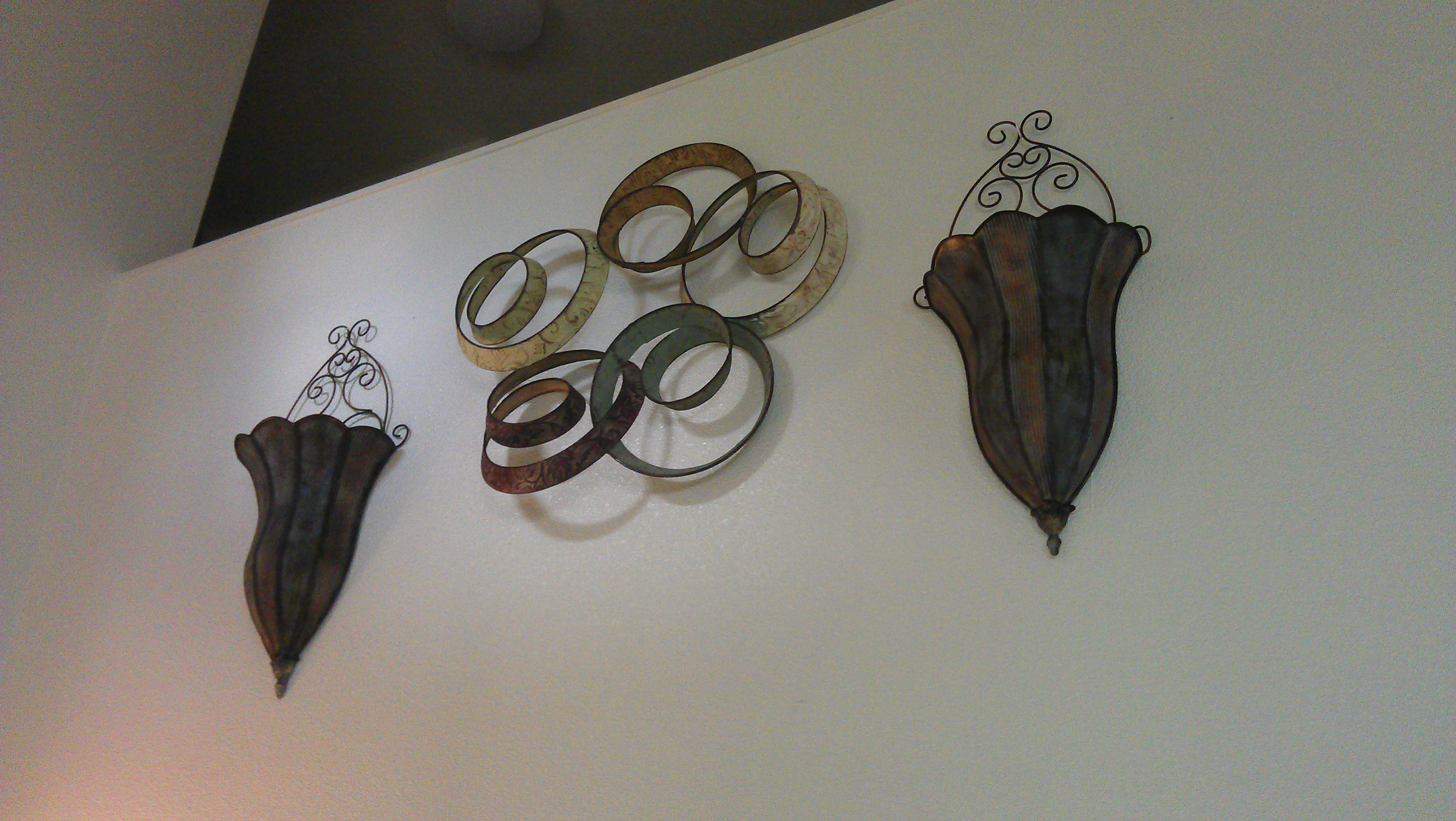 But during the rest of the year, well… It’s an awkward spot. But it needed something. About six months ago I found these really great wall sconces that worked well there, but they needed something between them. I tried hanging scrolls (cheap ones I’d had hanging there at one point in an attempt to decorate that spot) and I tried an expensive hanging scroll (wound up fitting in the bedroom better) and tried not hanging anything at all, but none of that worked. And then, lo and behold, I found the perfect piece. It’s a piece I’d considered before (from Pier 1) but it was always out of my price range (again, it’s from Pier 1), but today as I was strolling through their clearance section, I found that piece for about 40% less than the regular price.