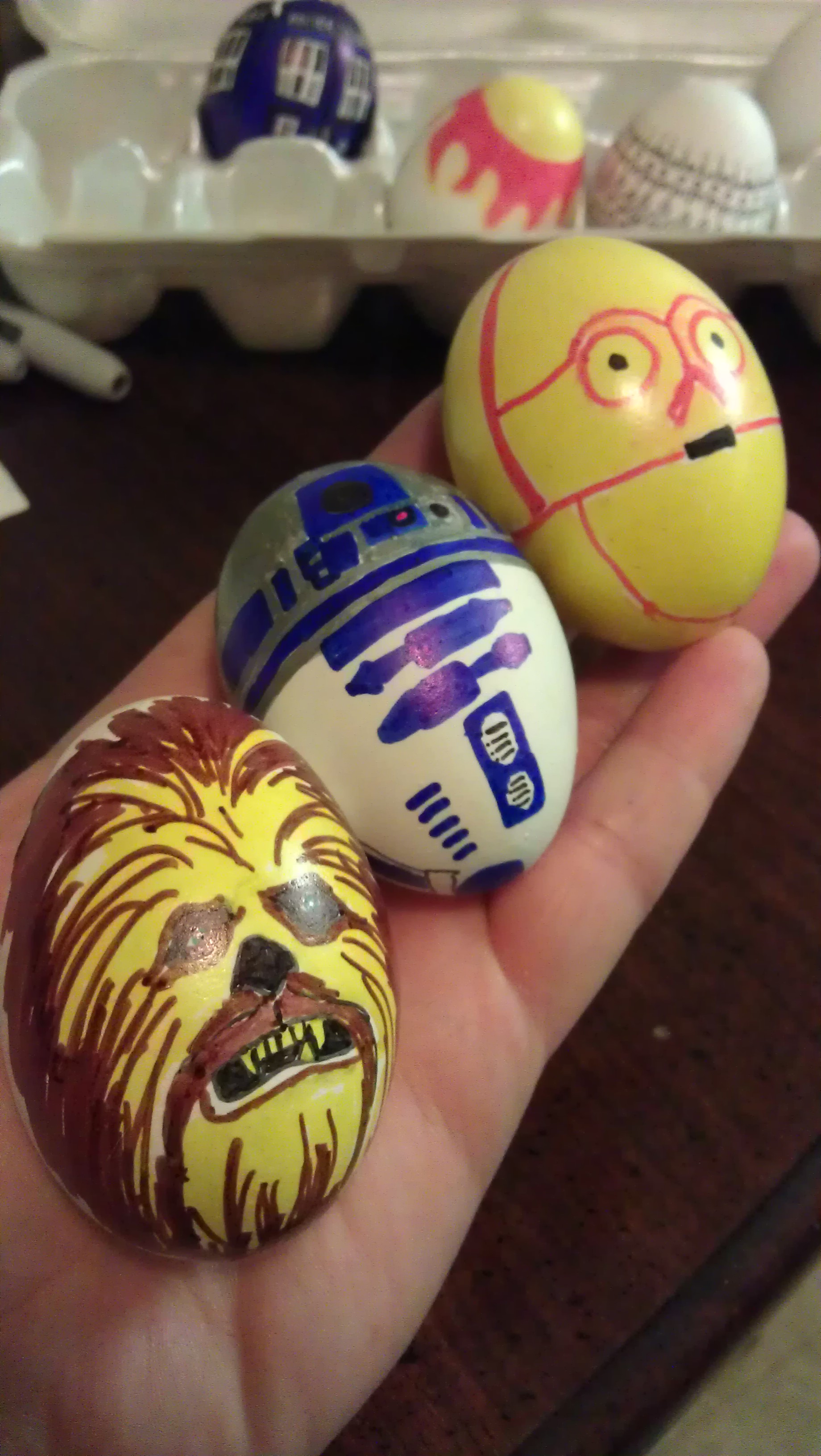 So then I dug out all of my Sharpies (turns out I have a lot of them) and started coloring… I did one that looks sort of like a little Faberge egg, then one that has a sun and moon (because of a book I loved as a kid), and then… well, then I noticed that I have a coupld of silver Sharpies… and that I could probably make an R2D2.