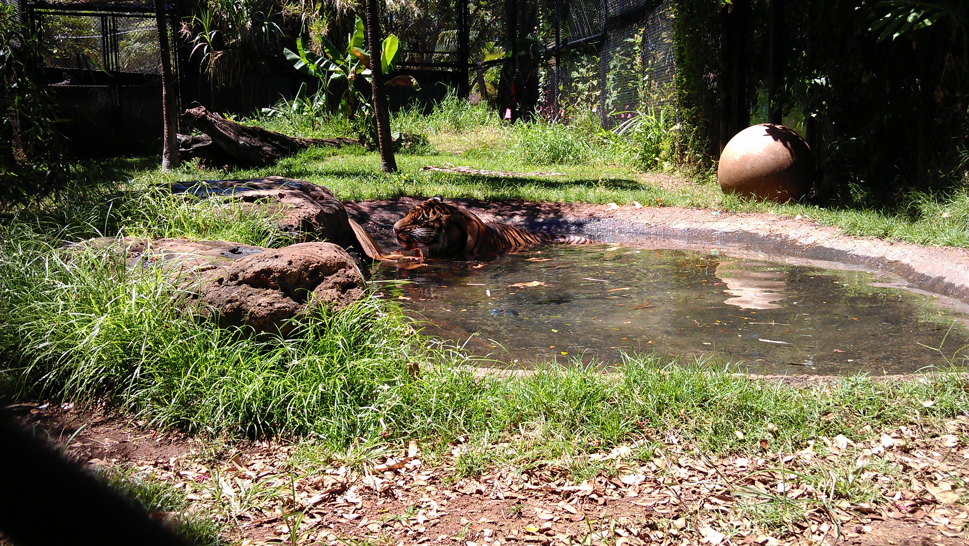 Tuesday we made toys for a couple of the tigers– cardboard boxes filled with shredded banana leaves and meat treats, then tied to a rope and dragged across the exhibit (through the fence) for them to chase. This guy likes to drag all his toys into the pool for a good soaking. ^_^