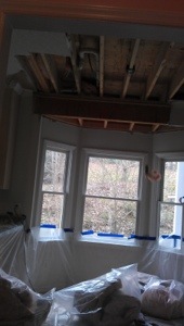 By then the ceiling (which, if you haven’t figured it out, is in the kitchen breakfast nook) was leaking in NEW places. See?