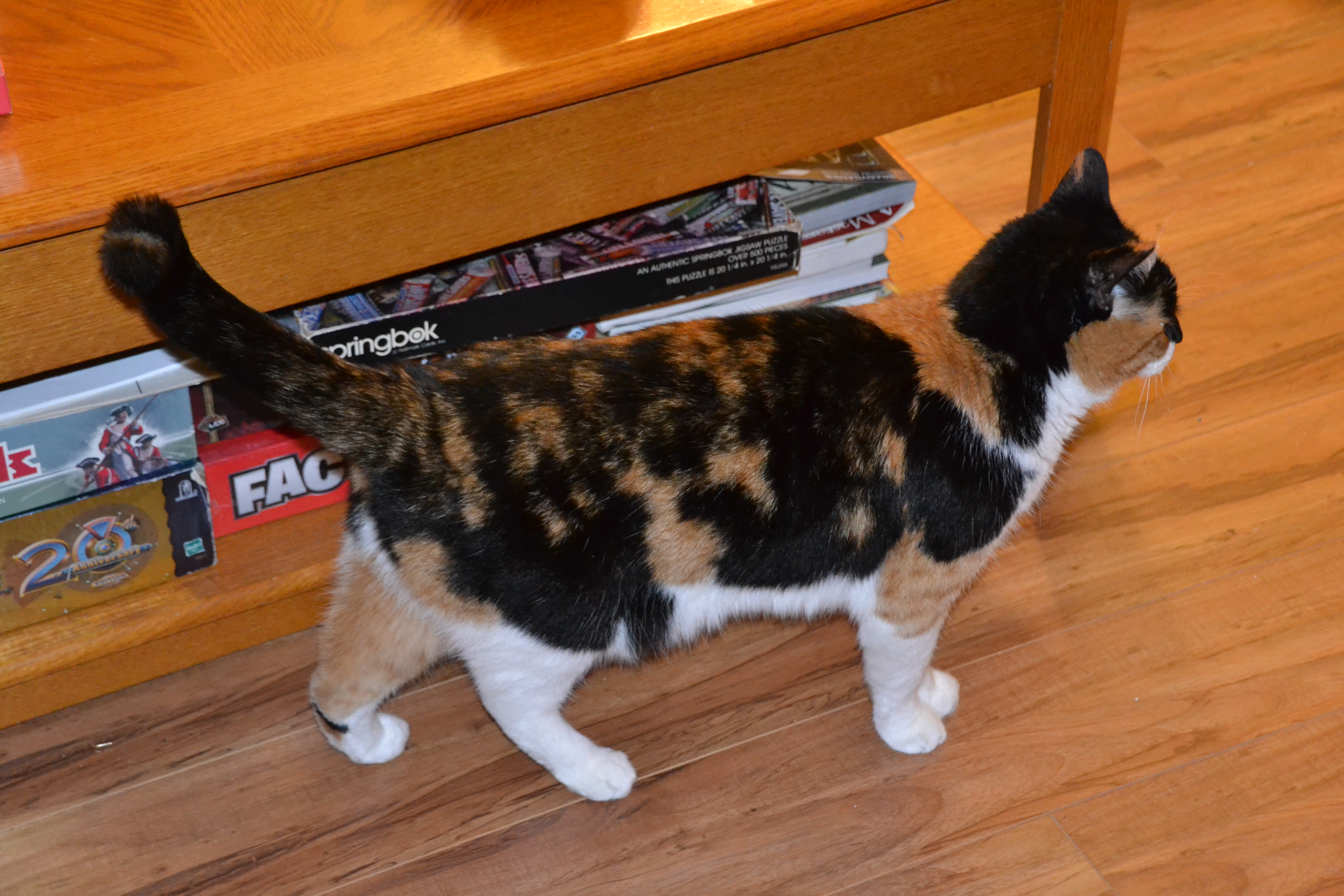 Check out the HIPS on that kitty cat! Caspian went from 15.3 lbs to 13.4, which is right in his range (like I said, he’s a big guy). Leena went from 13 to 10.8, which is also about right for her.