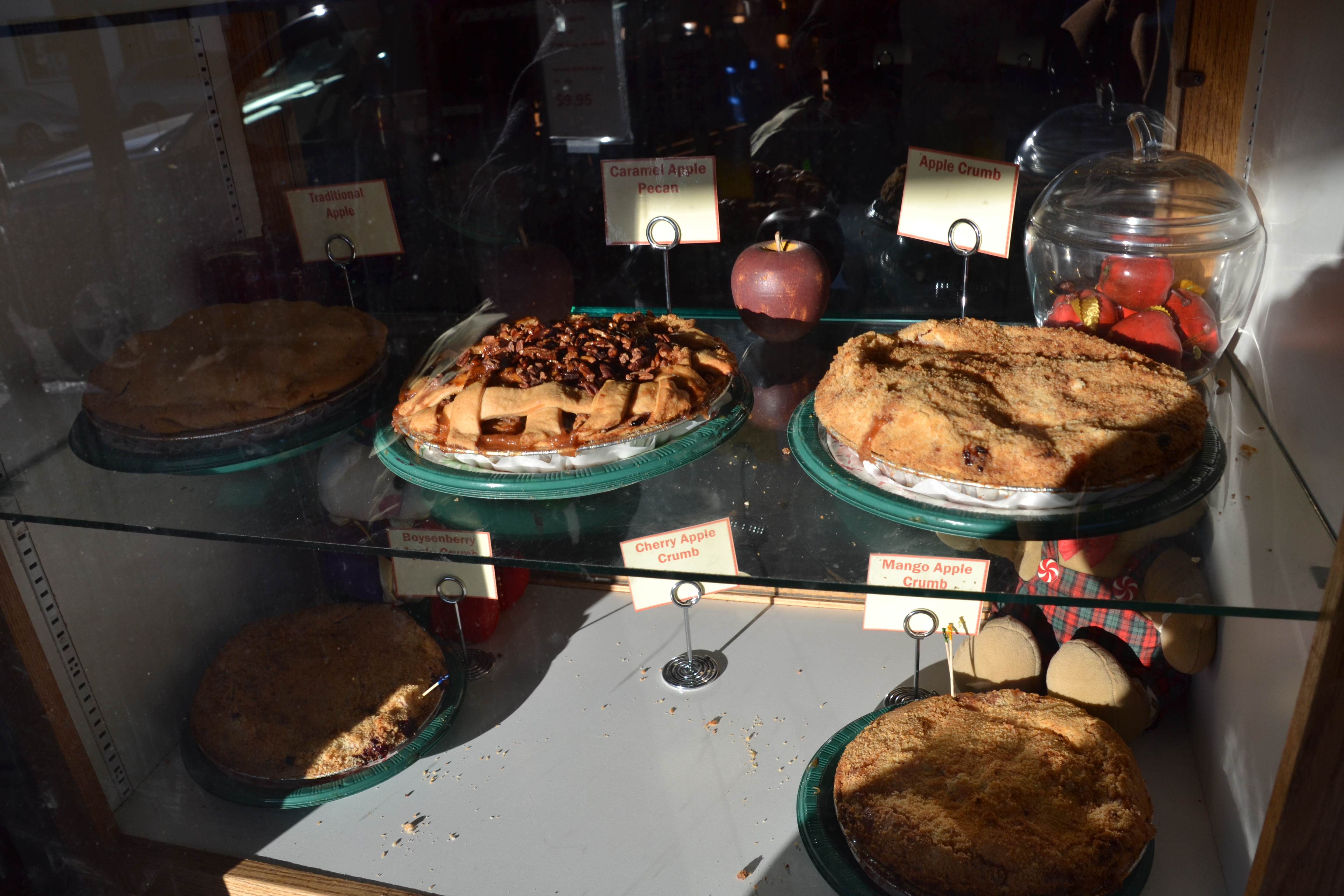 It certainly made for a pretty drive, and it was just old enough that the roads were clear. I was very glad of my coat, though; at home it was in the 70s that day! It was lunch time when we arrived, so we went into the first restaurant we saw, which happened to be a soda shop. I treated myself to a fountain vanilla coke, and watched them stir the vanilla and soda syrup together, then add the carbonated water and ice. Very cool and very tasty. After lunch, we visited their pioneer museum, made mostly of donations from people in the town and containing all sorts of interesting bits and bobs. Then it was time for pies!