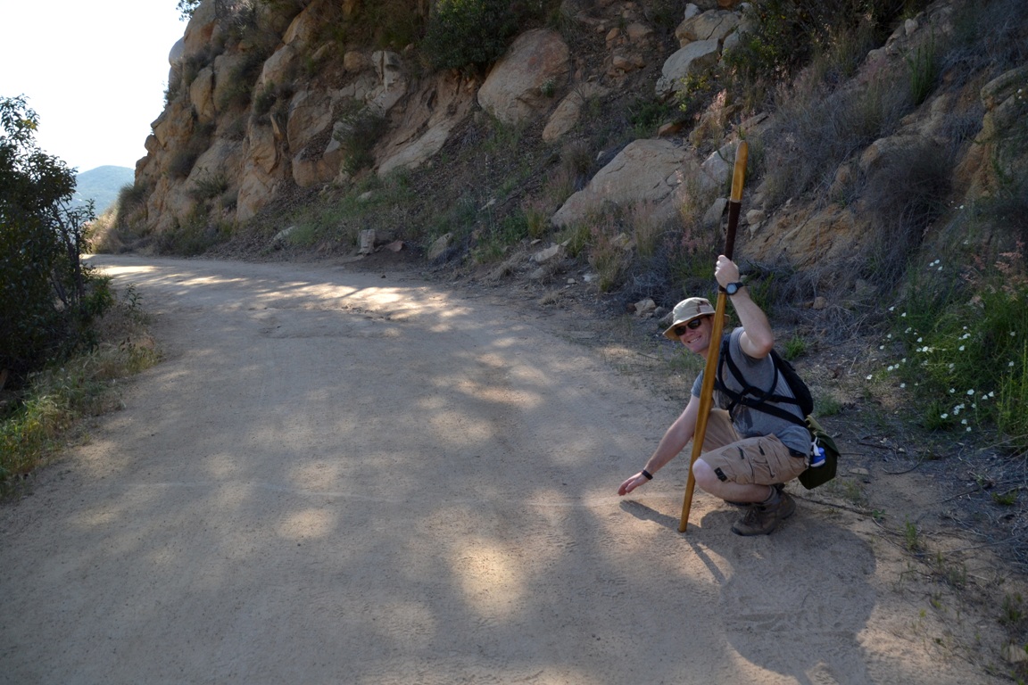 We also saw some really interesting wildlife, including a type of hawk we didn’t recognize, some songbirds, a woodpecker, several types of lizard (including the western fence lizard in this photo), plus evidence of snakes (they leave trails in the dust– see below) and possible tarantula burrows (which are actually kind of fascinating).