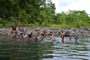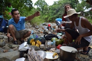 At lunch, we went to a local river with a natural swimming pool. We ate rice wrapped in banana leaves, fish, and bananas, then had fresh coconuts for dessert.