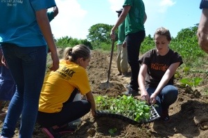 We planted pepper and bean seedlings, watered them, and then made little covers for them out of banana trunk pieces to keep the little plants from withering in the intense sun here.