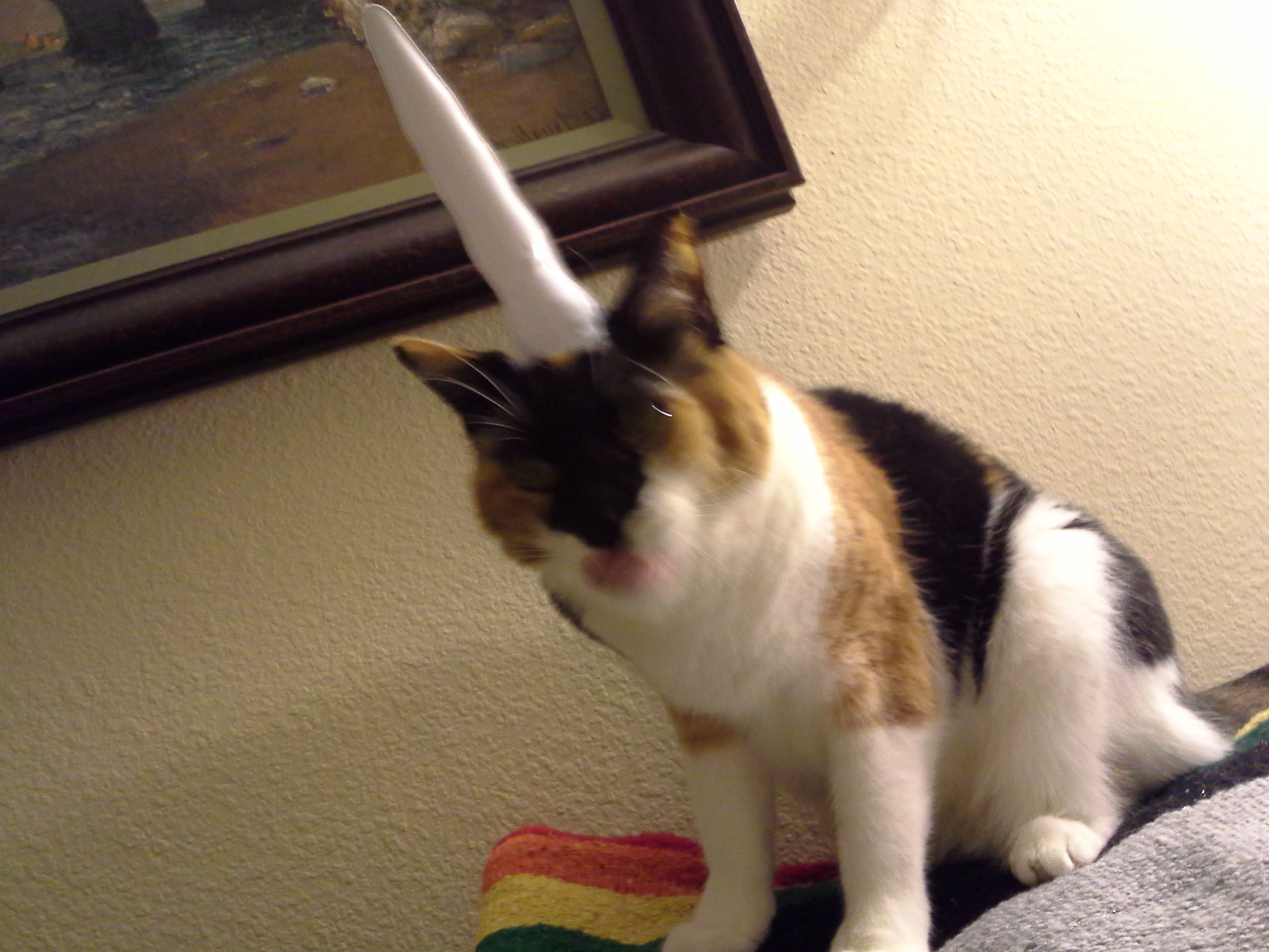 The horn had to be duct-taped twice, once for each cat to wear, because each one figured out how to hook a claw into it and pull it off of the head. They got a HUGE PILE of cat-cookies for this, dear reader, in case you are concerned for them.