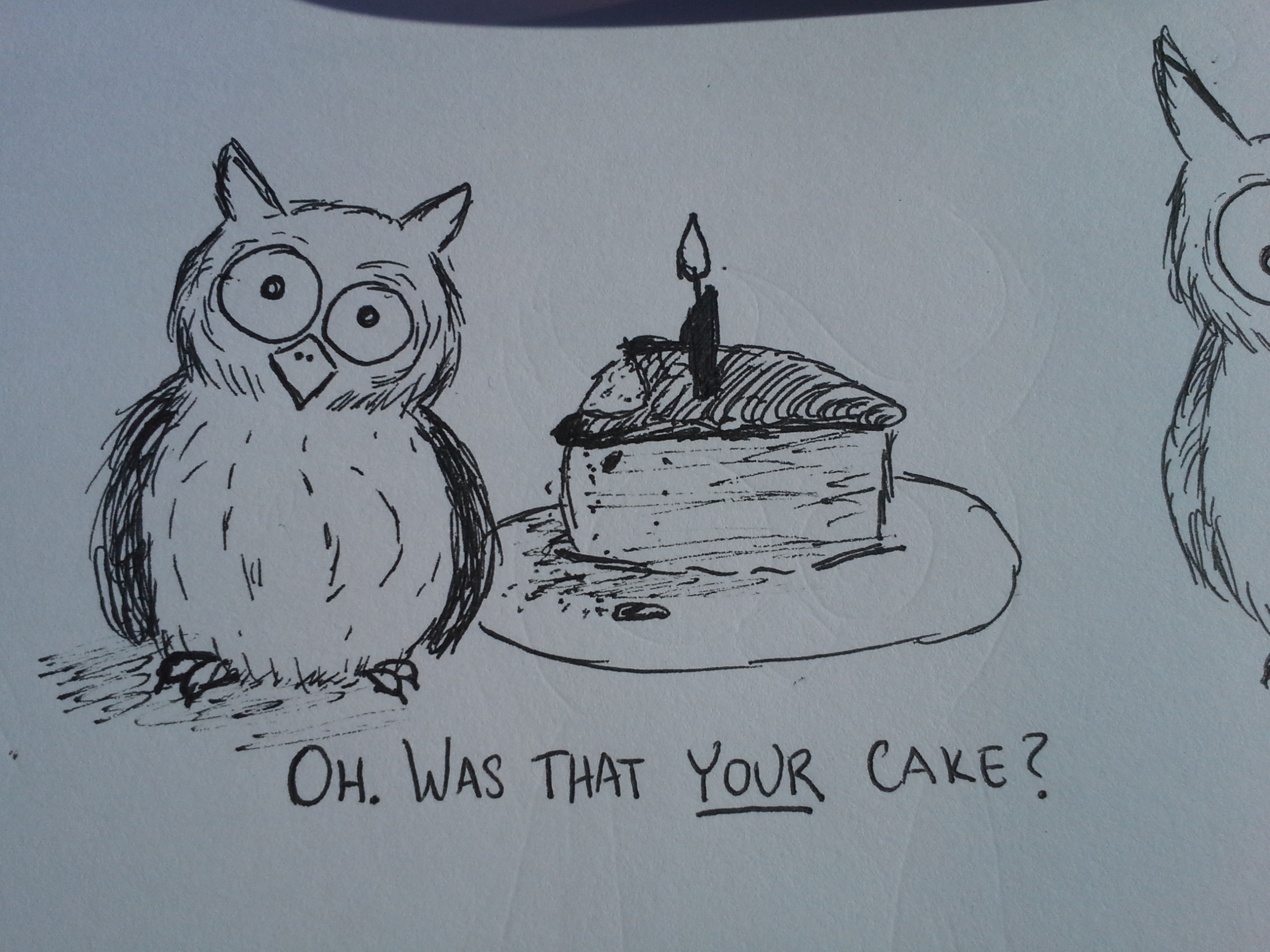 So there you go. I like that he looks a bit worried and also fat, like this isn’t an unusual snack. There were a lot of less-cute looking owls before this one that I won’t show you, but I’ve found a nice little “template” that I can reproduce, which is cool. No use for them at the moment, but maybe at some point I’ll think of something other than simply filling my sketch book.