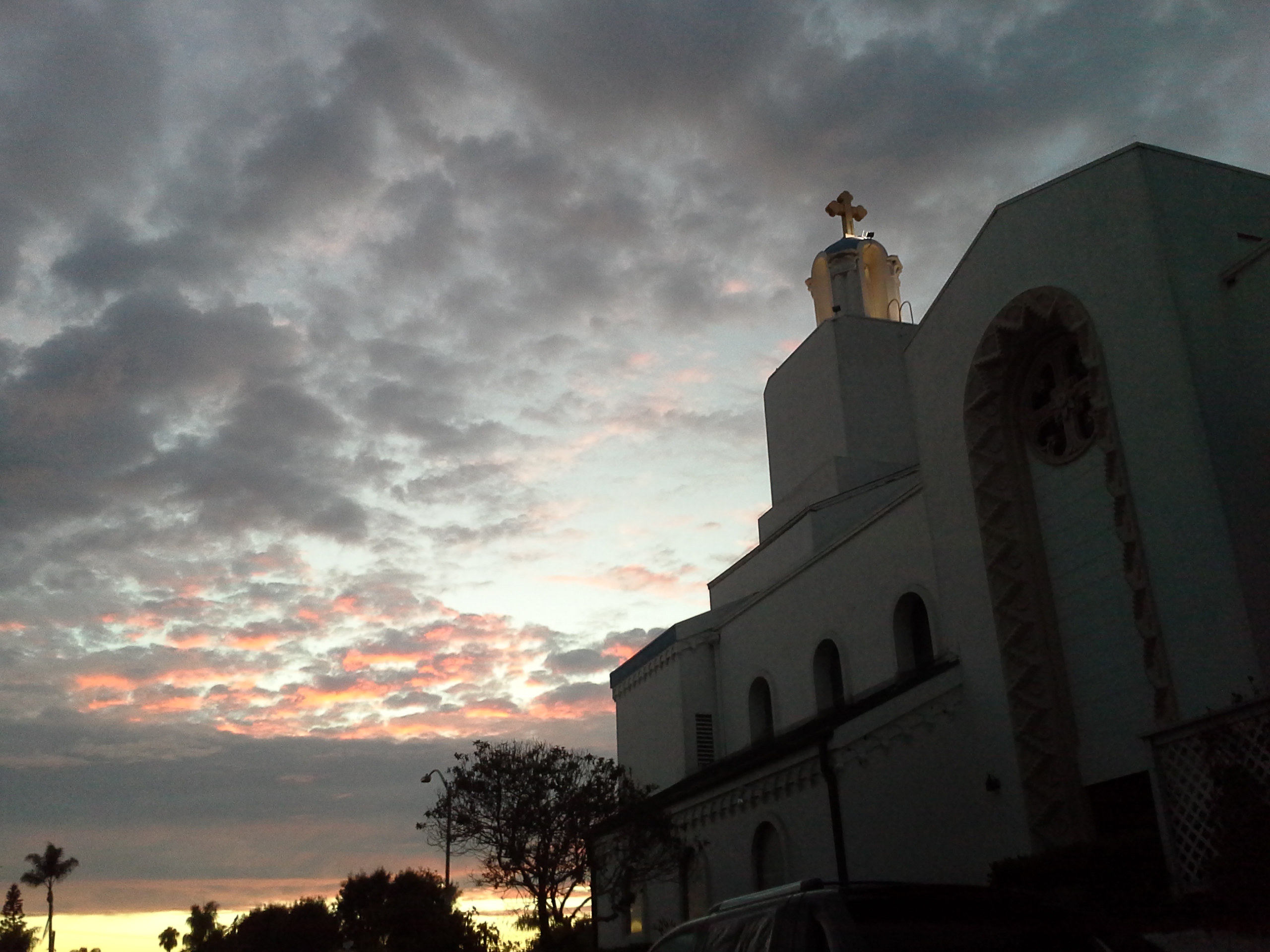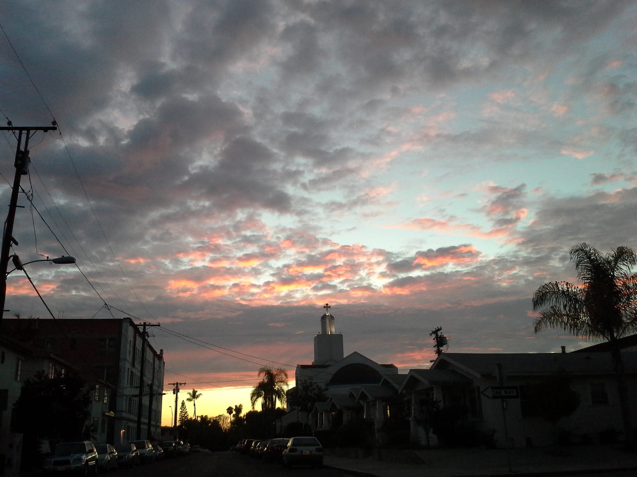 One of the things I miss about Hawaii is the sky. There were rainbows everywhere and the sunsets were always spectacular, as long as I didn’t go out to the beach specifically to watch one. Then it was always cloudy and weird on the horizon. But a few nights ago I caught a really gorgeous one as I was finishing my errands. Here you go.