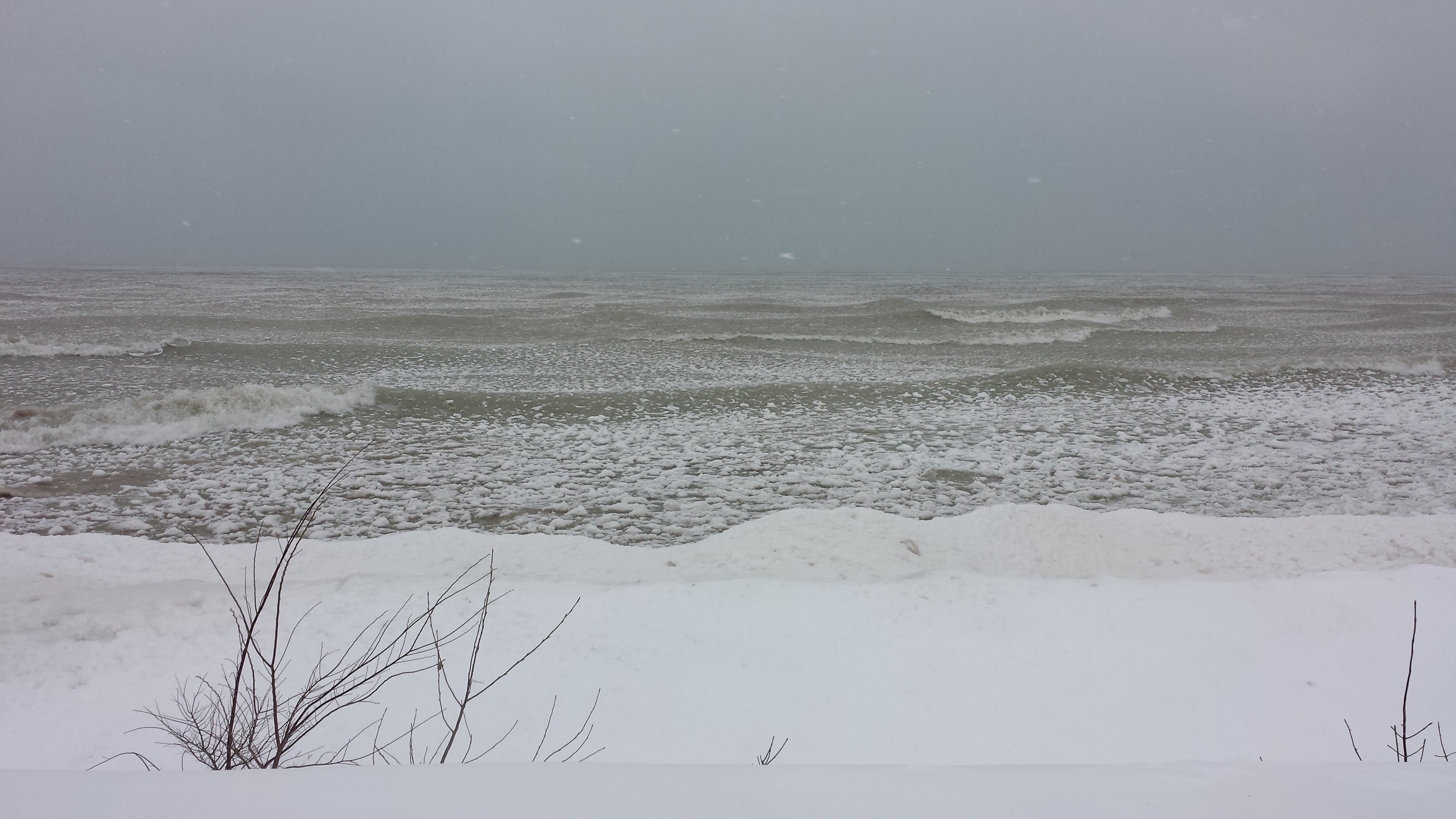 The ice floating on the water, the snow piled up in banks like sand dunes… It was pretty for about five minutes. Then I trudged my way back to Harriet (Jones, Subaru Outback) and headed home as the flakes got bigger and more accumulation announced itself.