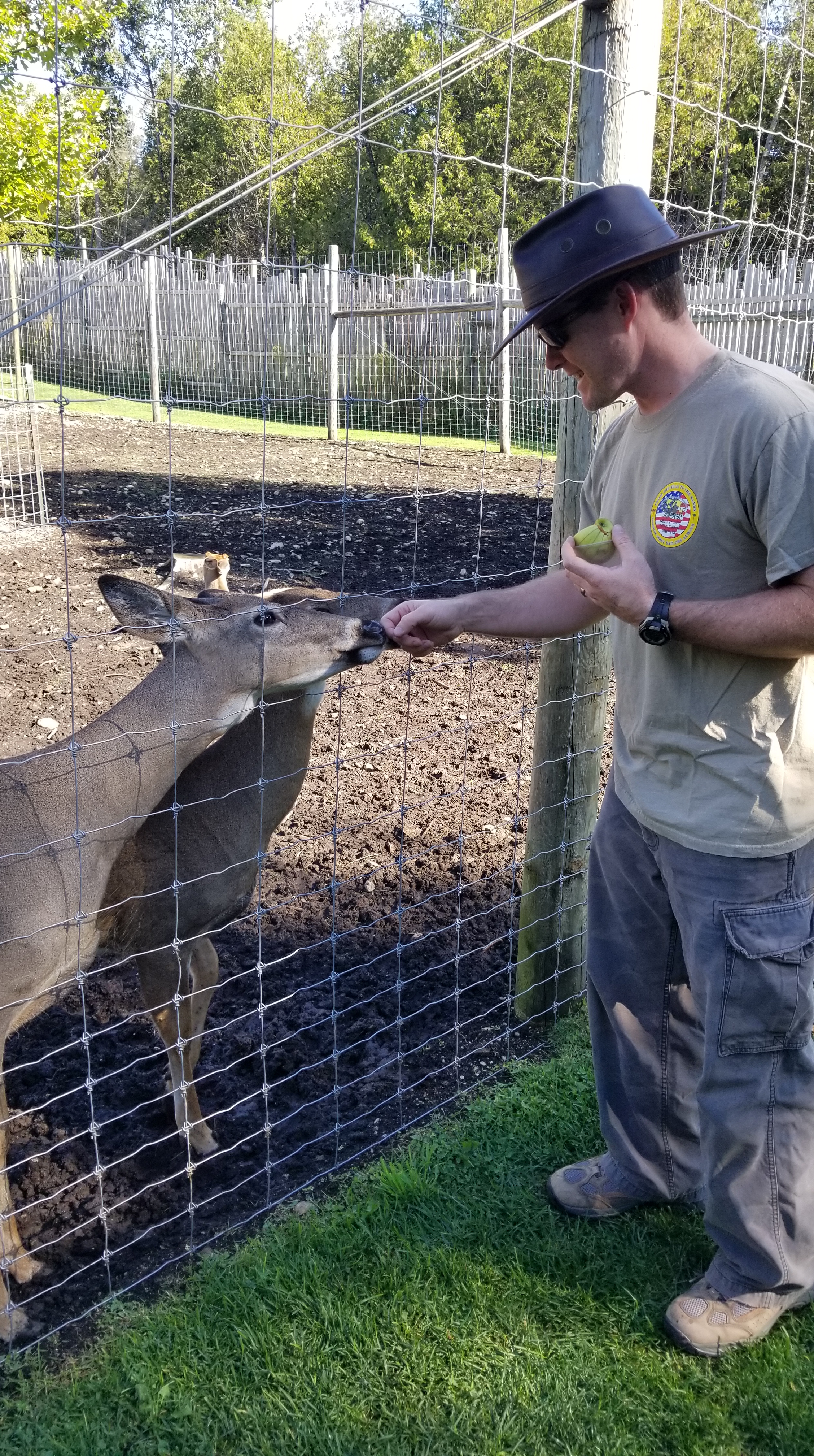 When you walk through the ranch, there are barns and runs for the fawns, a huge yard for the older does, and then several wooded lots in the back for the adult resident deer, including some leucistic (white morph) deer! Since they are hand-reared, they are pretty comfortable with humans, and many of them enjoyed having their ears and backs petted. (I made so many deer friends!)